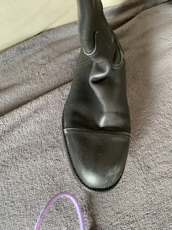 Bottes en cuir Fouganza, noires, taille 39 et taille M pour le mollet. Usées à certains endroits.