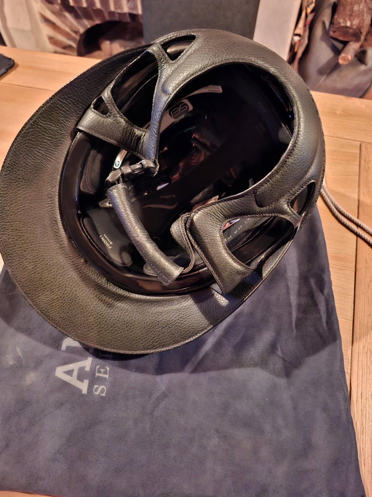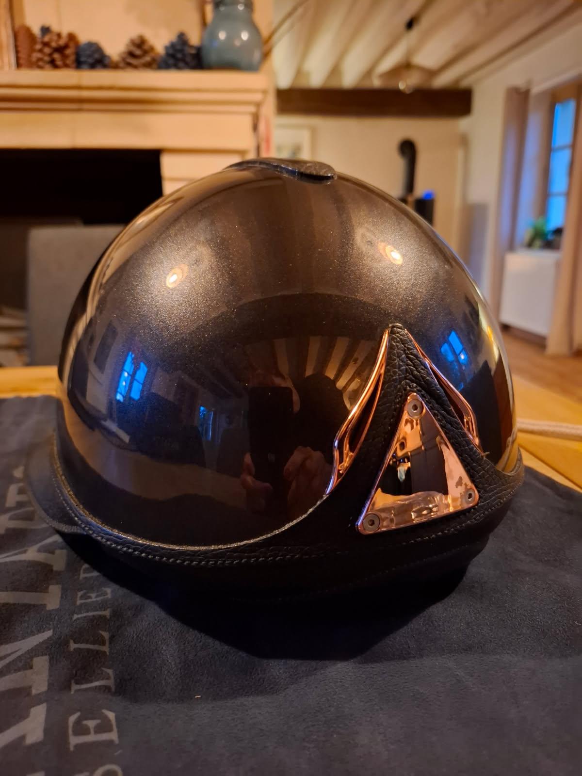 Casque personnalisé gris anthracite avec détails rose gold acheté salon du cheval de Paris déc 2024.
