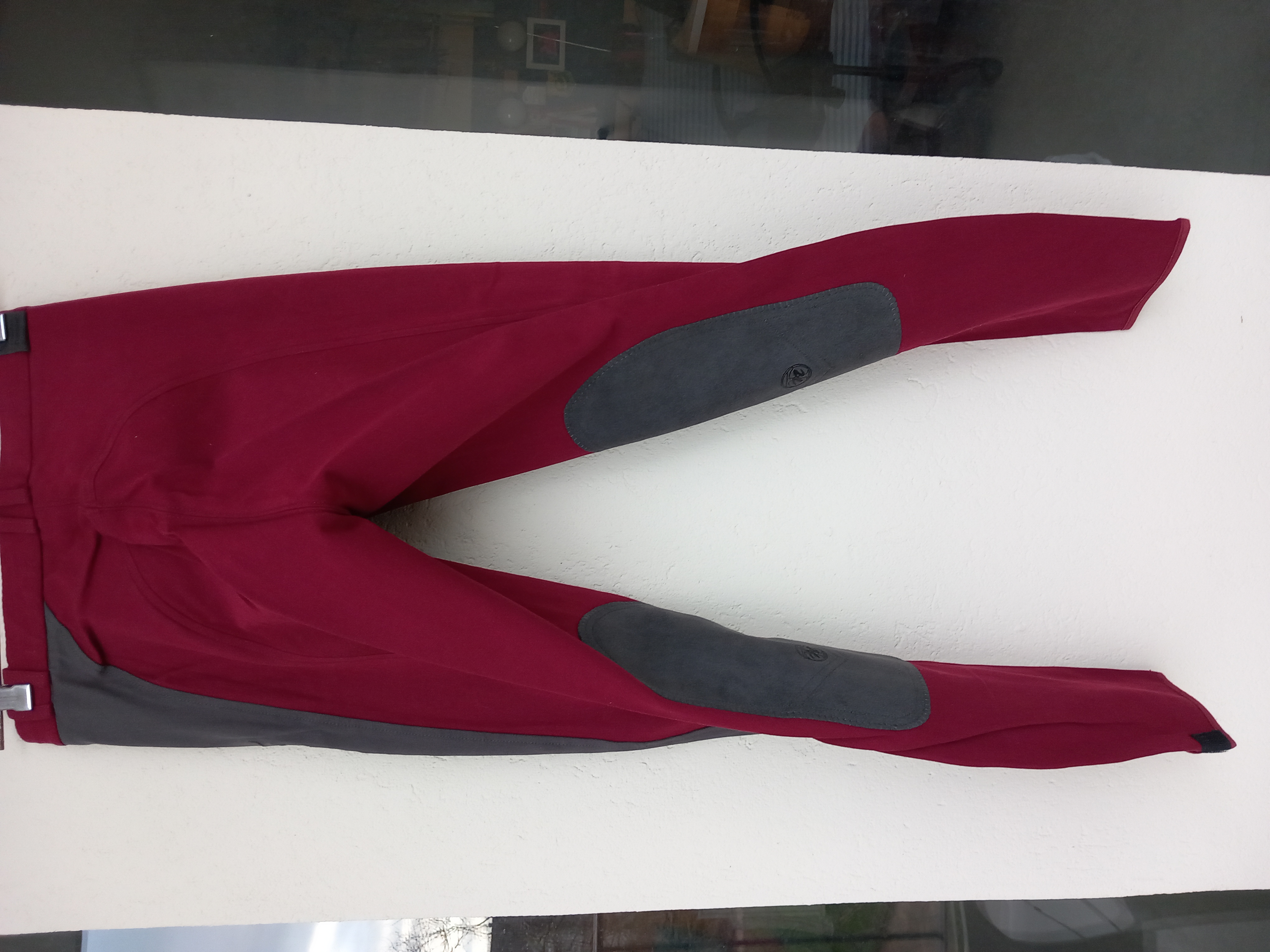 Pantalon d'équitation Nicolas Touzaint Bordeaux et gris (bande latérale sur jambe gauche, 2 basanes en peau)