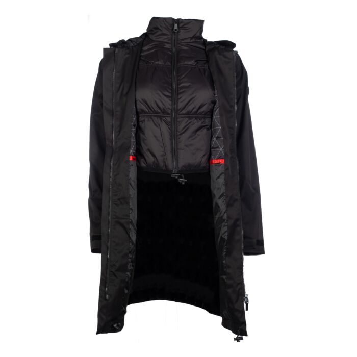 imperméable - respirant - coupe-vent - coutures étanches - taille réglable individuellement - grande poche intérieure - fermeture à glissière bidirectionnelle avec rabat - modèle 2 en 1 avec gilet intérieur - longues fermetures à glissière latérales avec impression intérieure réfléchissante - capuche avec cordon de serrage moderne - gilet intérieur avec élastique réglable - gilet intérieur amovible