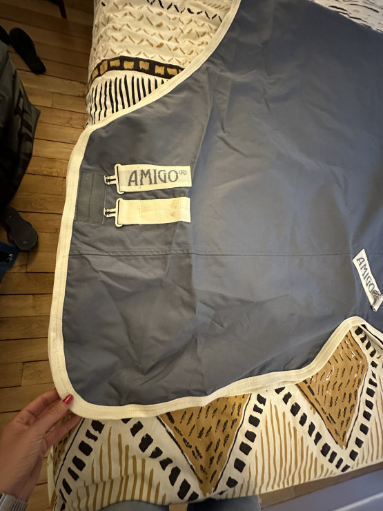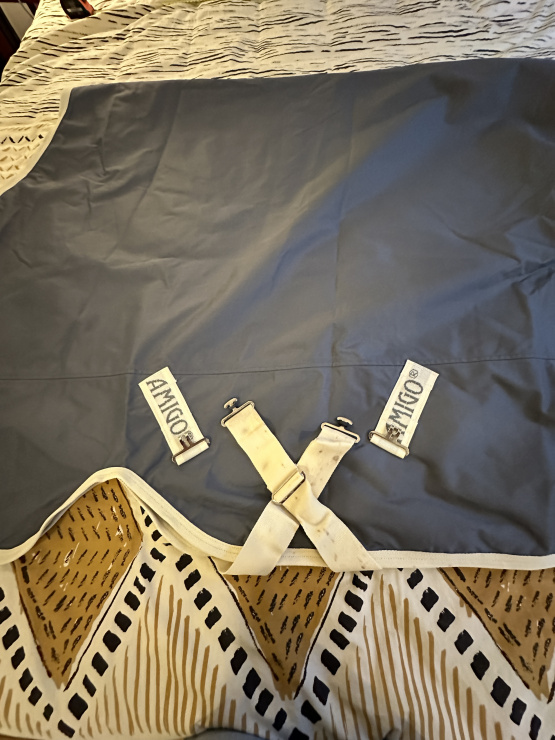Chemise d'extérieur légère de la marque Horseware, gamme Amigo, couleur bleu/gris avec liseré beige, taille 115 cm (5'6, 168 cm total). En état neuf, elle offre une protection idéale contre les intempéries tout en restant légère et respirante. Parfaite pour un usage quotidien en extérieur. Envoi rapide.