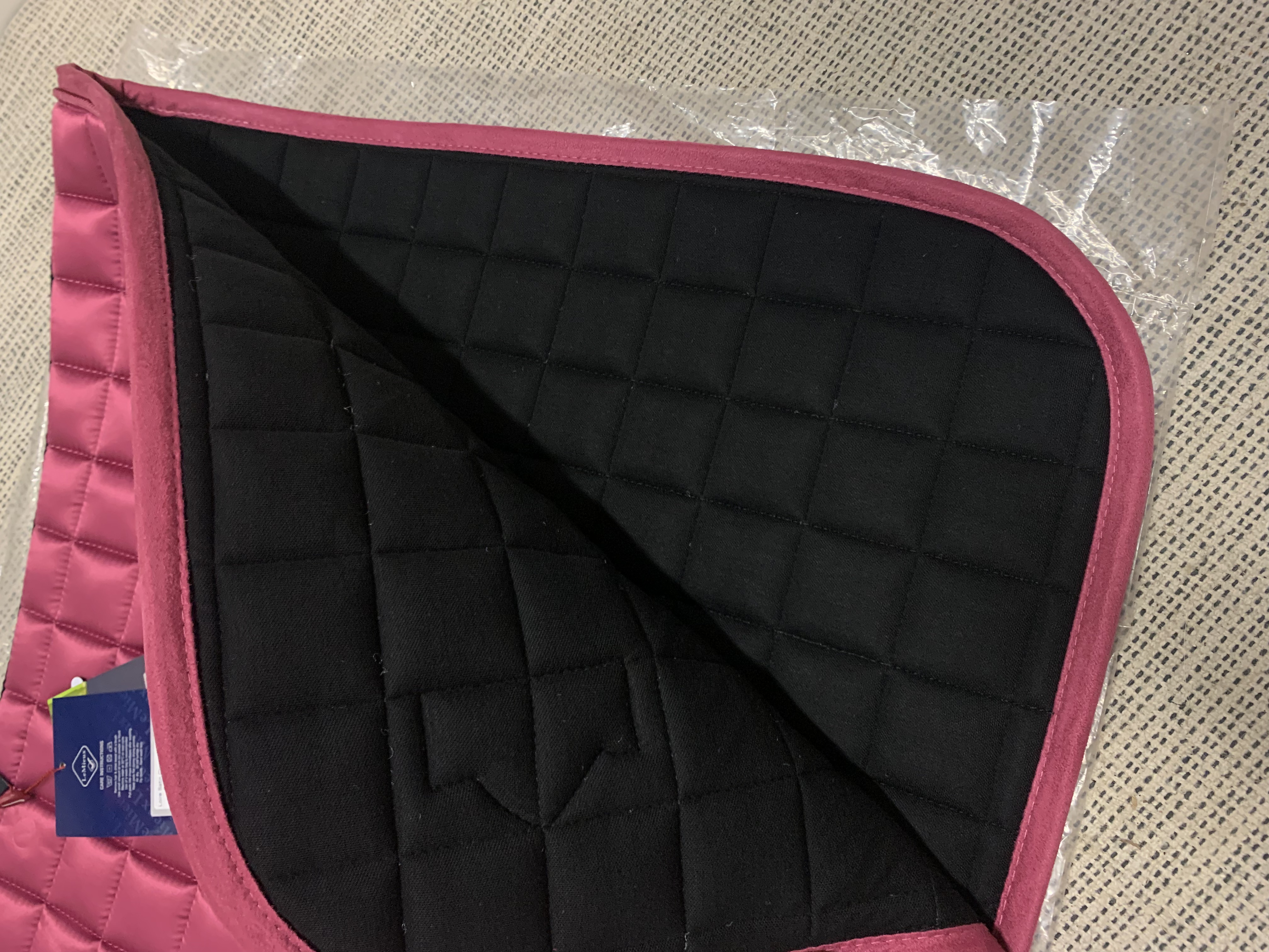 Je vends un tapis de dressage de la marque LeMieux coloris Loire French Rose. Le tapis d'équitation est neuf, étiqueté et dans sa pochette plastique. Taille cheval / Full / L. État neuf, prix boutique 89,95€.